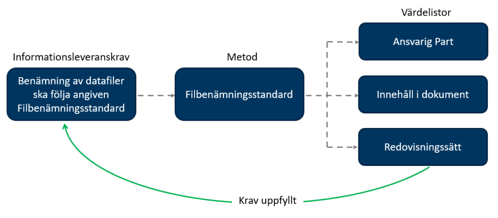 Enligt exempel nedan så finns det ett krav att datafiler ska följa fastställd Filbenämningsstandard. Metoden Filbenämningsstandard hänvisar i sin tur till ett flertal värdelistor som anger vilka värden som är accepterade att nyttja i filbenämningen. Använder man korrekt data från värdelistorna, bygger upp benämningen av datafilen enligt filbenämningsstandarden så uppfyller man kravet.